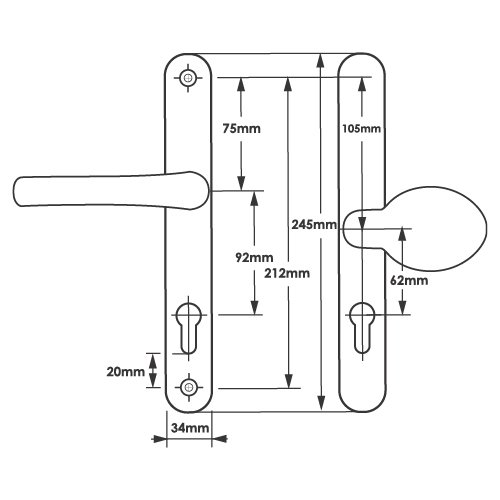 These Handles have a Sprung 92PZ internal lever handle and a 62mm PZ external moveable pad, with a backplate measurement of 245mm and screw centres measuring 212mm. The handles have undergone cycle testing of over 50,000 operations making them durable and reliable. The polished chrome, silver and polished brass finish has undergone salt-spray testing for over 480 hours.