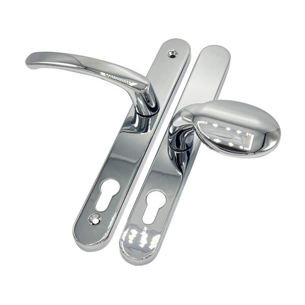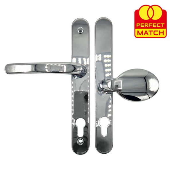 The 95/65mm Offset PZ TSS lever movable pad multipoint door handle is a high-quality multipoint door handle that is available in a range of finishes, including white, black, polished chrome, silver and polished brass.